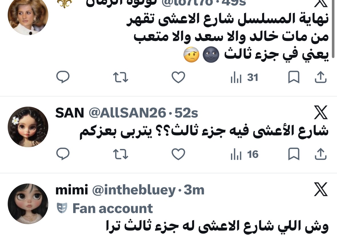 ومن جهة أخرى، عبّر بعض المتابعين عن عدم رضاهم عن النهاية، حيث قال أحدهم: “أكره النهايات الحزينة… كنسل شارع الأعشى ما راح أتابع”، بينما رأى آخرون أن القصة لم تنتهِ بعد، مع تعليقات مثل: “شارع الأعشى للحين فيه قصص كثيرة ما انقالت”، و”وش اللي شارع الأعشى له جزء ثالث؟”.