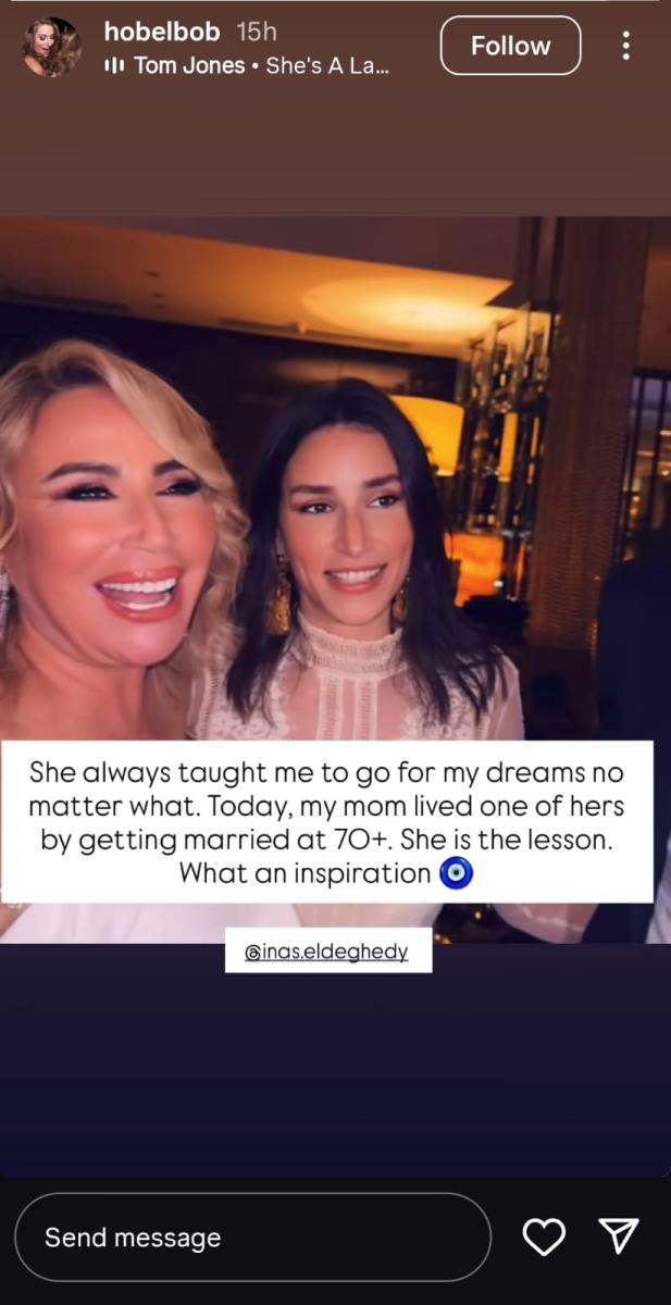 وكانت حبيبة ابنة إيناس الدغيدي علقت على زواج والدتها وكتبت في ستوري عبر إنستقرام: "كانت دائماً بتعلمنى أنى أجري وراء أحلامي مهما حصل، والنهارده أمي حققت حلم من أحلامها واتجوزت وهي فوق السبعين سنة، هي القدوة والمثال.. بجد ملهمة جدًا".