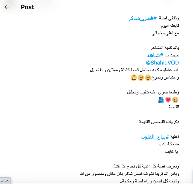 وعلق أحد المتابعين: " وثائقي قصة #فضل_شاكر تابعته اليوم مع اهلي وخواتي يالله كمية المشاعر حبيت ب #شاهد @ShahidVOD انو عاملينه كأنه مسلسل قصة كاملة وممثلين وتفاصيل ومشاعر ودموع🥹🥹😩وطبعا بسوي عليه تنقيب وتحليل 🥹💗🫂للقصة ذكريات القصص القديمة اغنية #بياع_القلوب ضحكة الدنيا يا غايب ونعرف قصة كل اغنية كل نجاح كل فشل وبامر الله قريبا نشوف فضل شاكر بكل مكان ومنصور من الله وكيف كل انسان وراه قصة وحكاية..".