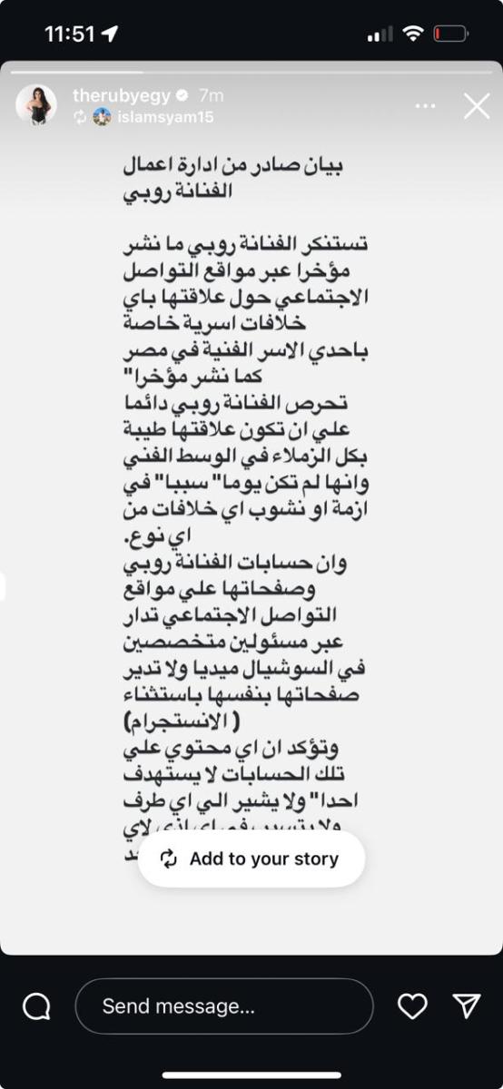 أصدر إسلام صيام، مدير أعمال روبي، بيانًا رسميًا نُشر عبر خاصية "ستوري" على الحساب الرسمي لها بموقع التواصل الاجتماعي إنستغرام، استنكر خلاله الزج باسمها في خلافات أسرية تخص إحدى العائلات الفنية الشهيرة، وقال صيام في البيان: «تستنكر الفنانة روبي ما نُشر مؤخرًا عبر مواقع التواصل الاجتماعي حول علاقتها بأي خلافات أسرية تخص إحدى الأسر الفنية في مصر، كما تم تداوله مؤخرًا عبر مواقع التواصل الاجتماعي».