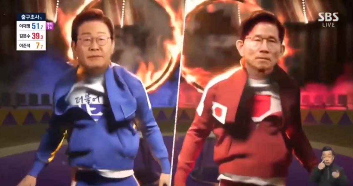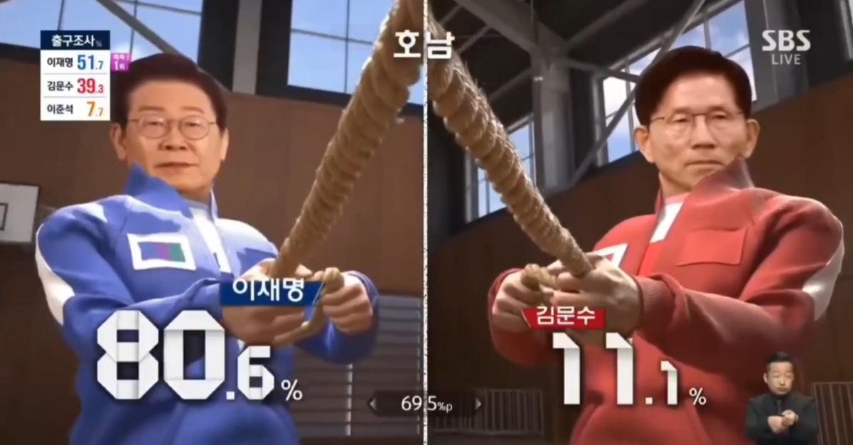 في مساء الثلاثاء 3 حزيران، وبعد انتهاء الانتخابات الرئاسية المفاجئة في كوريا الجنوبية، التي استلهمت أجواؤها من مسلسل 'لعبة الحبار' (Squid Game)، جذبت قناة SBS الكورية الخاصة الأنظار بأسلوب تغطية غير تقليدي، إذ ظهرت رسوم متحركة تُظهر المرشحين يتسابقون على خيول ألعاب صغيرة، بينما بدا المرشح الليبرالي لي جاي ميونغ مبتسمًا وهو يتفوق على خصمه المحافظ كيم مون سو.