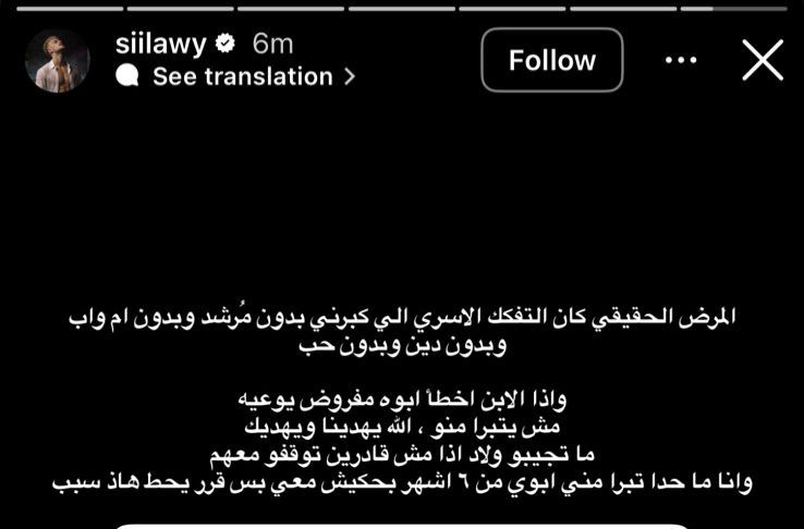 وفي ستوري آخر، ردّ على من اتهمه بـ"المرض"، قائلاً إن "المرض الحقيقي هو التفكك الأسري الذي كبرني بدون مرشد وبدون أم وأب وبدون دين وبدون حب"، مضيفاً: "إذا الابن أخطأ، أبوه المفروض يوعيه مش يتبرأ منه… الله يهدينا ويهديك".