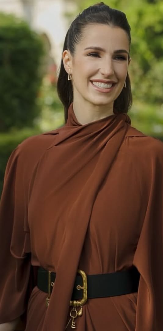ولإضفاء لمسة عصرية مميزة، اختارت الأميرة رجوة حزامًا من دار سكياباريللي Schiaparelli، والذي أعاد رسم ملامح الفستان بطريقة مبتكرة.