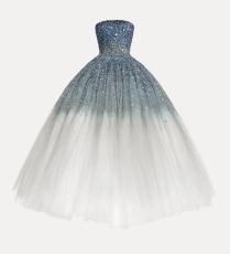 اختارت بلقيس فستانًا من دار أوسكار دي لارنتا Oscar De La Renta، تميز بتصميم واسع ومن دون أكمام بأسلوب الـ Ballroom أي التنورة الضخمة. جاء الجزء العلوي منه بلون رمادي لامع مصنوع من الترتر، وانتقلت درجات اللون تدريجيًا إلى الأبيض في التنورة. مزج الألوان والتدرجات أعطى للفستان طابعًا حالماً، يجمع بين الأناقة والتميز بطريقة متوازنة.