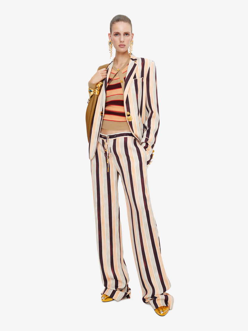 وتنساب سراويل الساتان المخططة بخفة، مترافقة مع كنزات الكشمير الناعمة التي تتحرك بسهولة مع الجسد. أما أطقم الفيسكوز بدرجات التوب الترابية، والمزينة بأزرار Keyhole  وسلاسل ذهبية دقيقة، فترتقي بمفهوم الراحة إلى مستوى الكوتور. كل تفصيل هنا مدروس ليعكس انسجاماً بين القوة والنعومة، وبين الحضور والسكينة.
