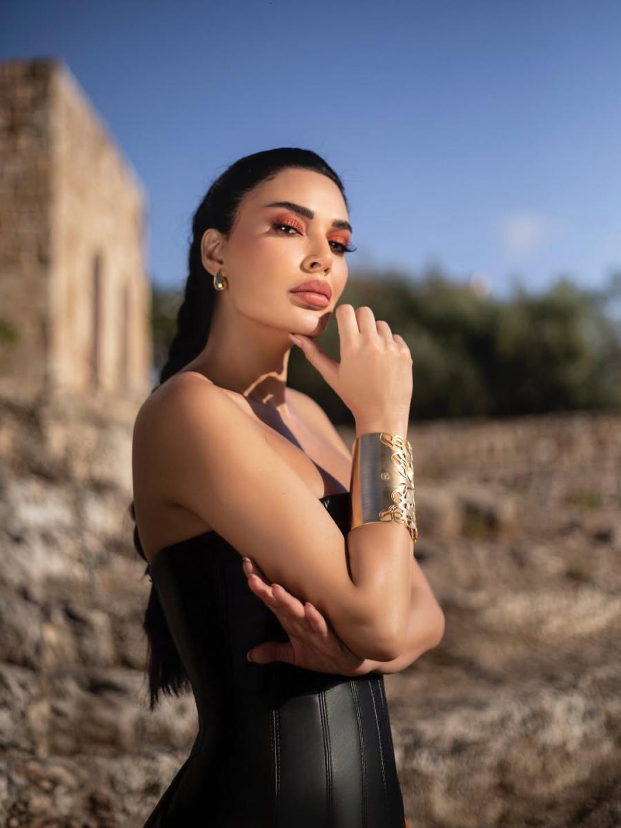اعتمد التصميم الذي اختارته سيرين عبد النور على كورسيه جلدي طويل باللون الأسود، يتميز بقصّة محددة وStructured تبرز قوة البنية وتضفي لمسة درامية على الإطلالة. الكورسيه استحضر في طياته دروع المحاربات في العصور القديمة، لكن بلمسة عصرية أنثوية تتماشى مع روح الموضة الحديثة. تم تنسيق الكورسيه مع تنورة طويلة بلون برتقالي ناري، تنساب بقماش متطاير وبثنيات عريضة تضيف خفة وحركة، فتخلق تبايناً ذكياً بين صرامة الجزء العلوي ونعومة الجزء السفلي. ولإكمال هذه الإطلالة، اختارت سيرين سوار ذهبي عريض، إلى جانب أقراط ذهبية ناعمة.